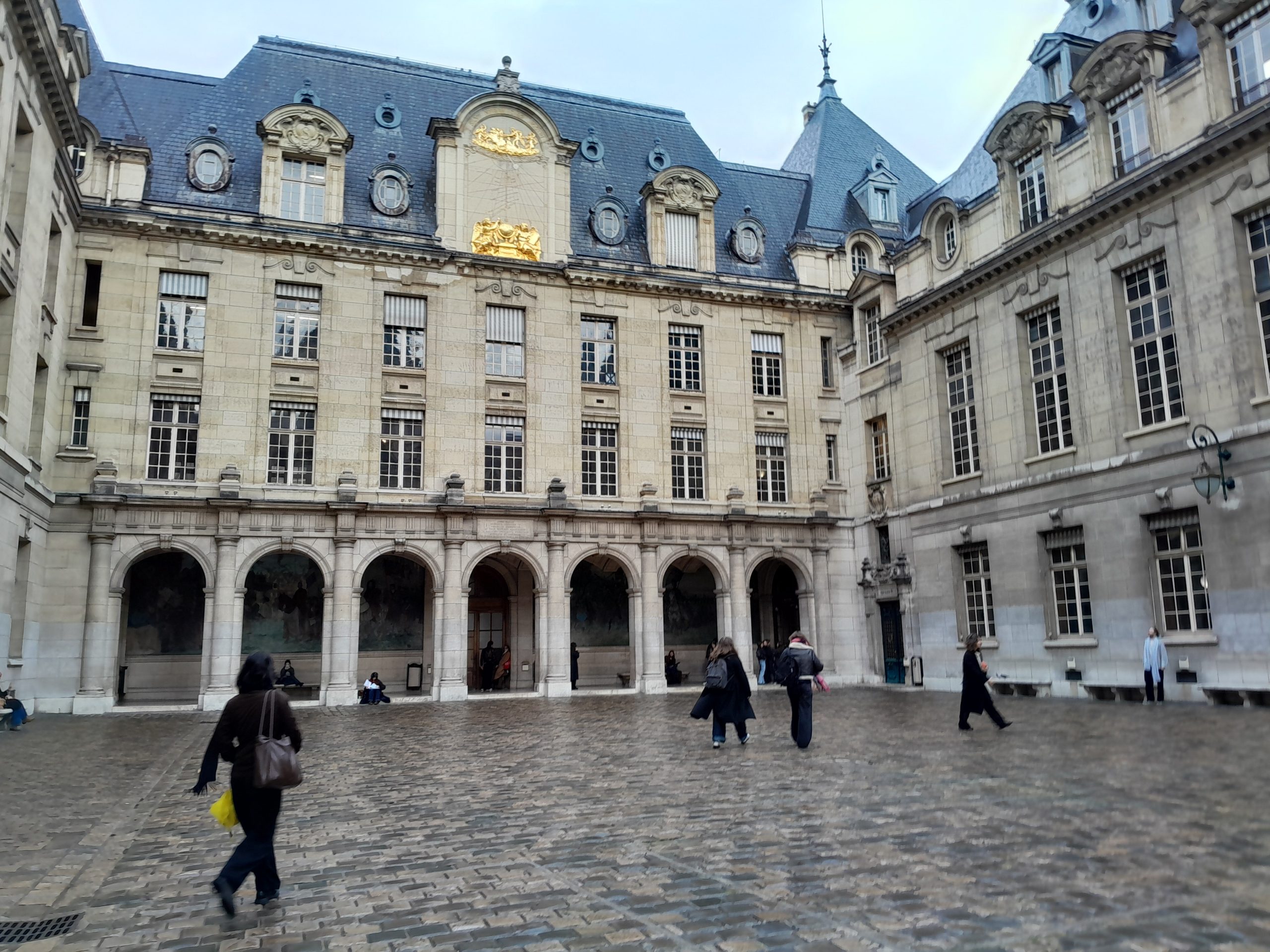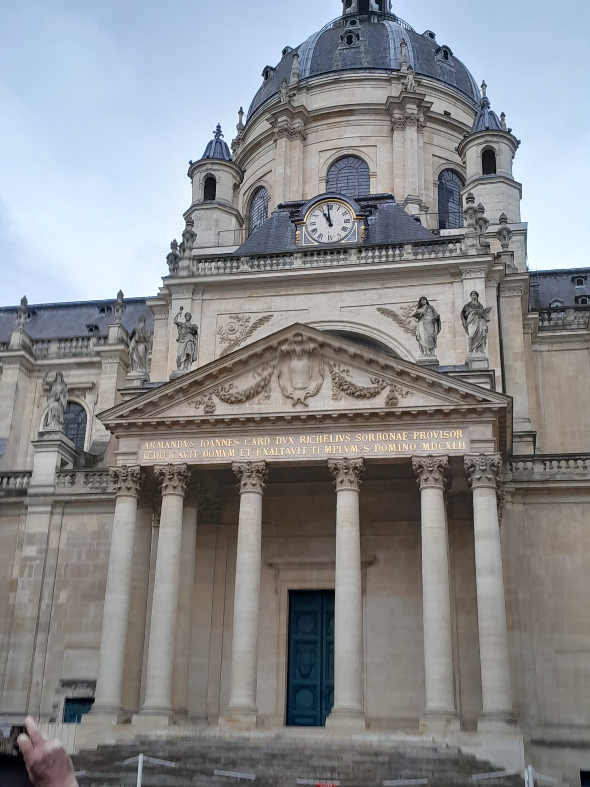 Maria notre sympathique et très intéressante guide commencera sa visite dans la cour d’honneur, rue de la Sorbonne, où l’on peut encore voir les traces sur le sol de la première chapelle du collège fondé par Robert de Sorbon dans les années 1250. Sur la droite se dresse  la chapelle saint Ursule, mélange de traditions françaises et italiennes, élevée entre 1634 et 1642. Là repose le Cardinal Richelieu, qui en devint le proviseur en  1622 et en financera la première grande réfection en 1627. Malheureusement, elle ne se visite pas pour des raisons de sécurité, mais des travaux de restauration ont commencé et l’espoir d’une réouverture au public est d’actualité.
