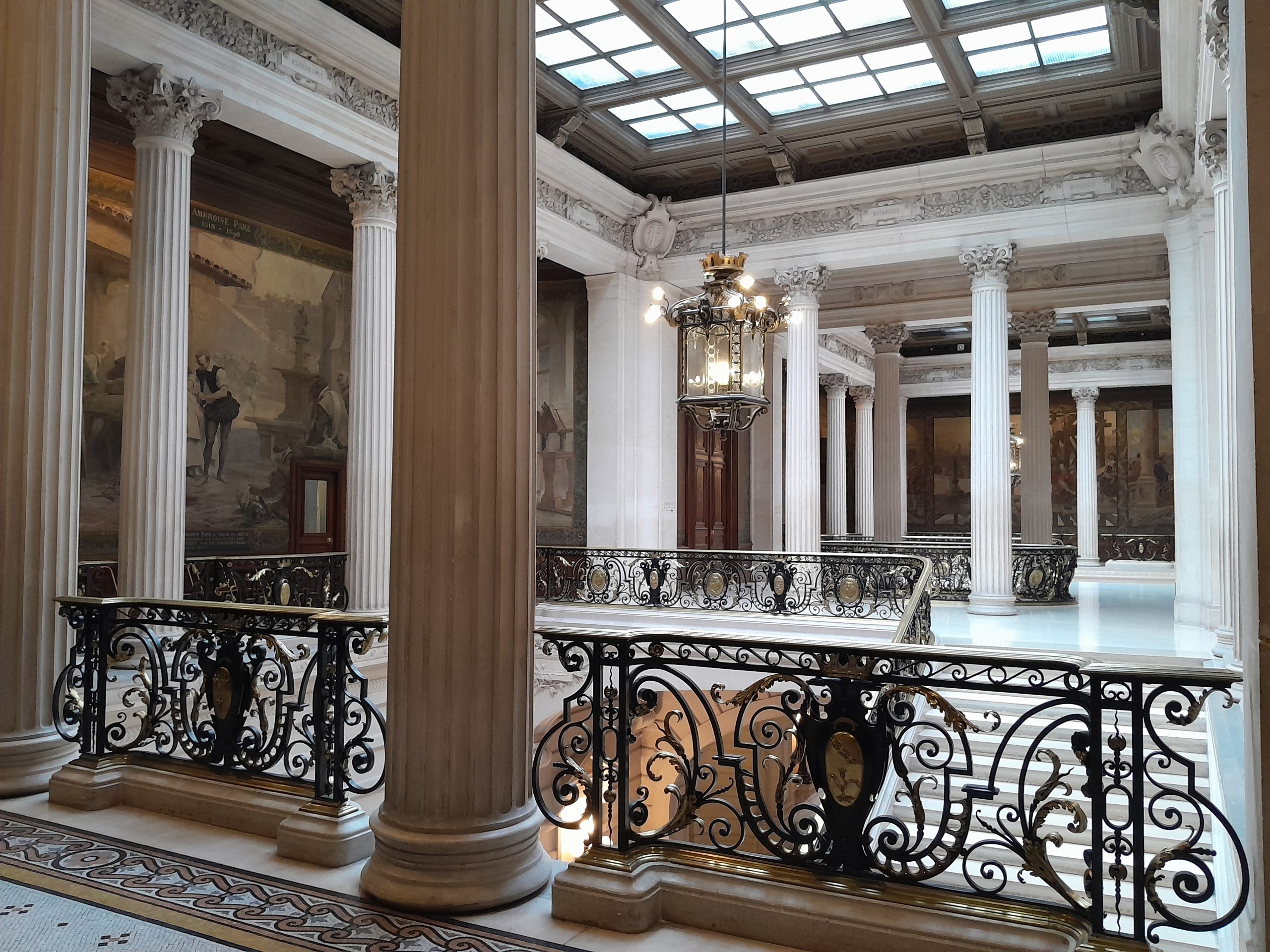 Par la rue des Ecoles, nous pénétrons à l’intérieur du bâtiment où s’offre à nos yeux un immense hall et un hall où le plan de ce bâtiment est représenté, avec ses accès et la répartition des pièces. Après avoir gravi un majestueux escalier  surgit un vaste espace quadrangulaire aux hautes colonnes cannelées : le péristyle – entouré de peinture représentant les grands évènements qui se sont déroulés dans ce bâtiment – et qui donne accès à une succession de salons de réception tous plus beaux les uns que les autres tant par leurs plafonds, leur mobiliers, et leurs décorations (toujours utilisés aujourd’hui pour les grandes cérémonies.