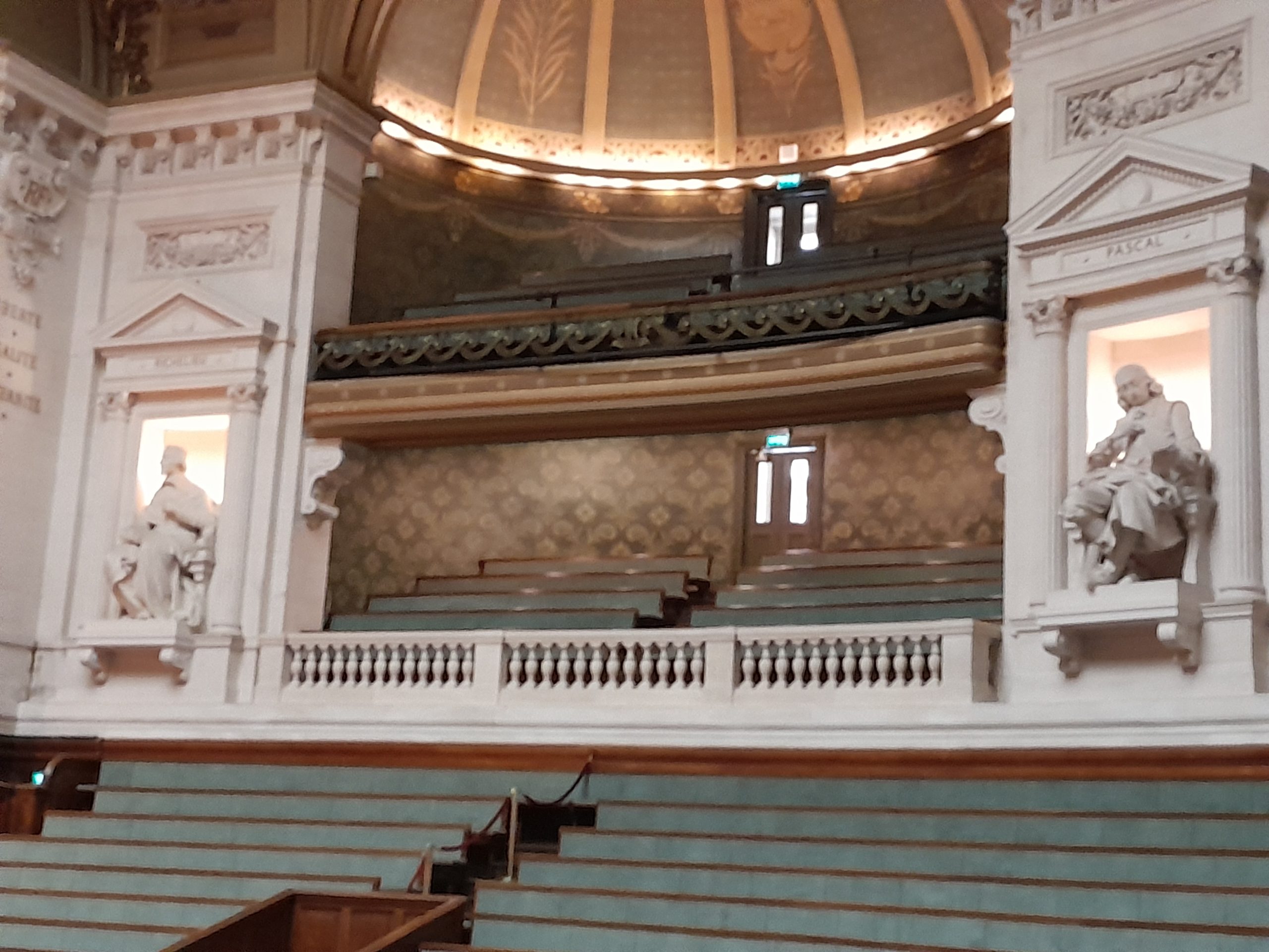 Nous terminerons par le « bouquet final  » : le Grand Amphithéâtre. Avec ses nombreux décors célébrant les Lettres, les Sciences et les Arts, le lieu est désormais  classé au titre de monuments historiques. Inauguré le 5 août 1889, Il s’étend sur 2 630 m2 et a la possibilité d’accueillir près de 1 000 personnes. Depuis des décennies, il est devenu le lieu de nombreuses manifestations, conférences, tables rondes,  concerts et même défilés de mode.Lieu symbolique, il est notamment choisi pour la remise de diplômes universitaires et de prix. Il est composé de dix tribunes réparties sur deux étages, avec tout autour des gradins. Au sein de la coupole, on trouve également cinq grands médaillons qui représentent les cinq Facultés constituant la Sorbonne en 1889 : le Droit, la Médecine, les Sciences, les Lettres et la Théologie. Au-dessus de l’estrade, s’étend la toile marouflée Le Bois Sacré réalisée par Puvis de Chavannes, qui célèbre les Lettres, les Sciences et les Arts sur ses 25 mètres de long.