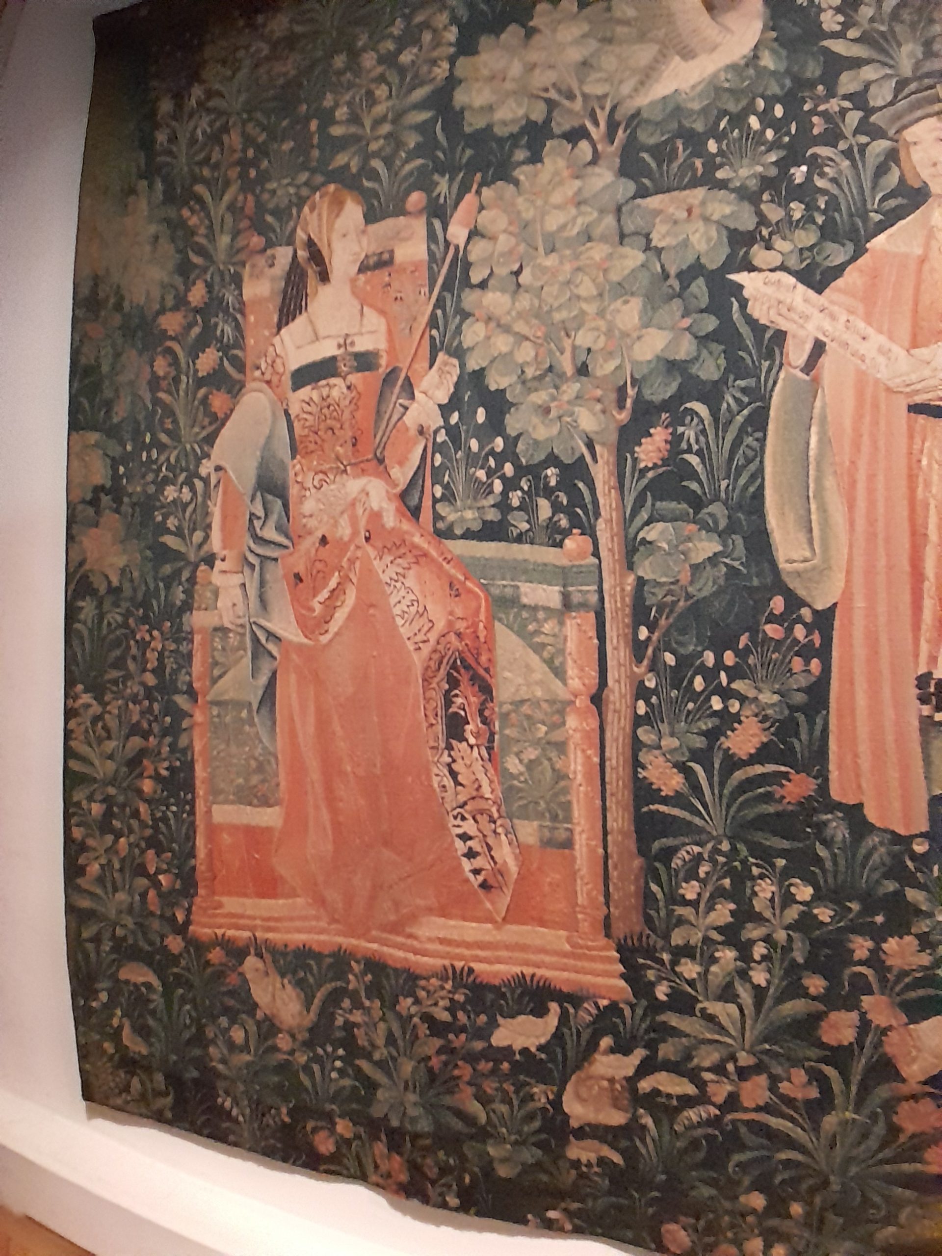Dans une première étape, ce sont les habitudes de cette époque pour prendre les repas et les nourritures consommées suivant son rang social qui nous ont intéressés (avec des vitrines montrant vaisselle, ustensiles et aussi des aquamaniles pour se laver les mains !!)Puis nous avons découvert l’importance des jeux au Moyen Age  en nous arrêtant devant les vitrines  montrant des boîtes à jeux, des cartes, des monnaies. On connaissait les échecs, les jeux de cartes, la roulette ;le trictrac..Les sociétés médiévales attachaient aussi une grande attention à  l’apparence, notamment au vêtement, et se préoccupent de l’hygiène  on prenait des bains : tout  cela s’accompagnait d’une intense production d’objets liés à la toilette, visibles dans certaines vitrines ou sur des tapisseries.La vie seigneuriale  tournait autour de la broderie, de la promenade, de la lecture, des scènes galantes, la chasse: les tapisseries à fonds de millefleurs en témoignent