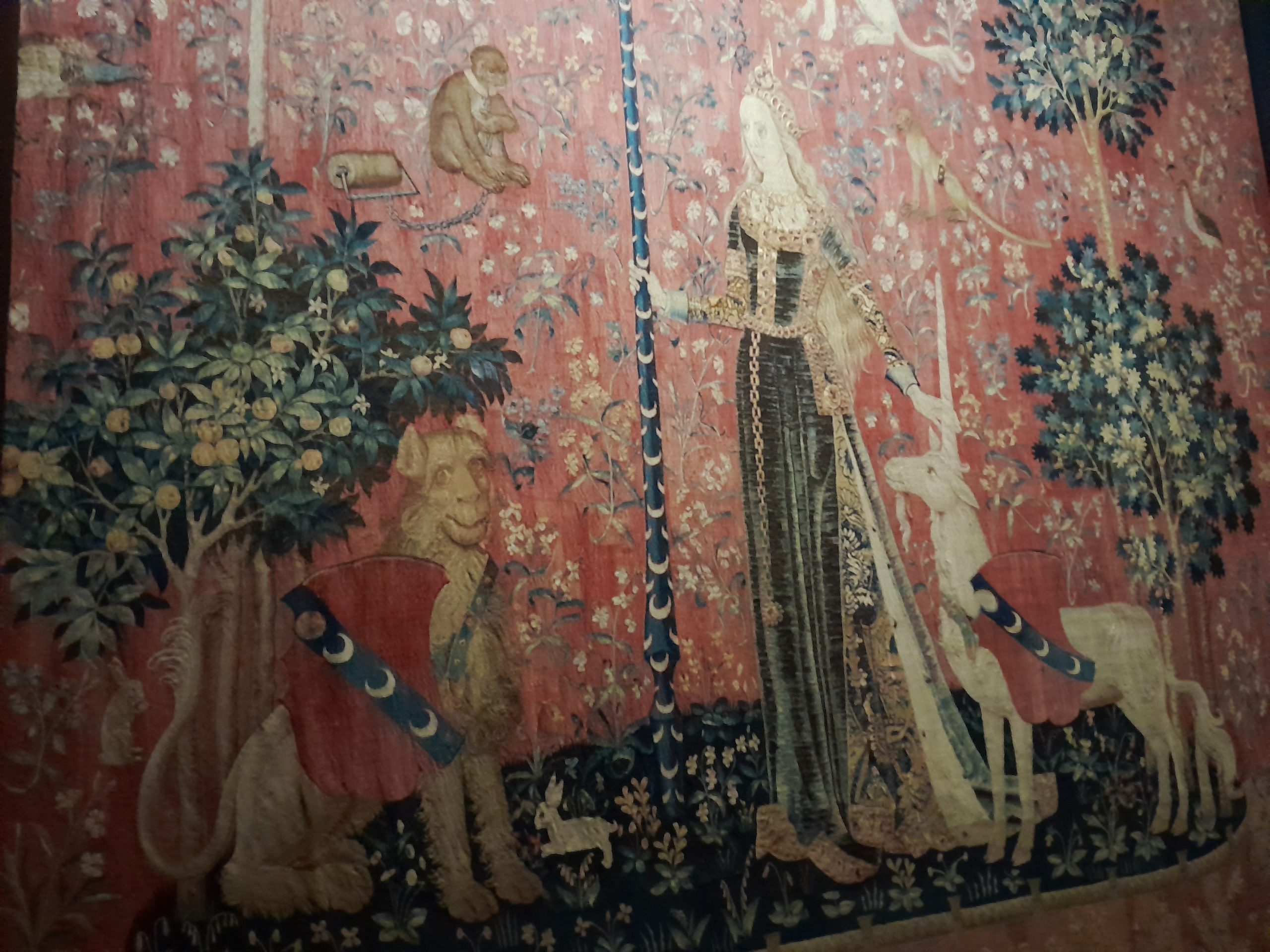 La famille Jouvenel des Ursins I Musée de ClunyNous nous sommes aussi arrêtés devant  ce long tableau sur bois -un des rares témoignages de la peinture parisienne au milieu du 15e siècle – où s’alignent les membres de l’opulente famille Jouvenel des Ursins. Celle-ci  comprend en effet un prévôt des marchands de Paris, un président du Parlement de Poitiers, deux évêques et archevêques, un chancelier royal. Parmi les dames, se trouvent une veuve, deux religieuses, et deux femmes mariées reconnaissables à leur coiffure à cornes. Un témoignage de ce qu’était une famille très riche.Nous avons terminé notre visite par les célèbres tapisseries de la Dame à la Licorne.